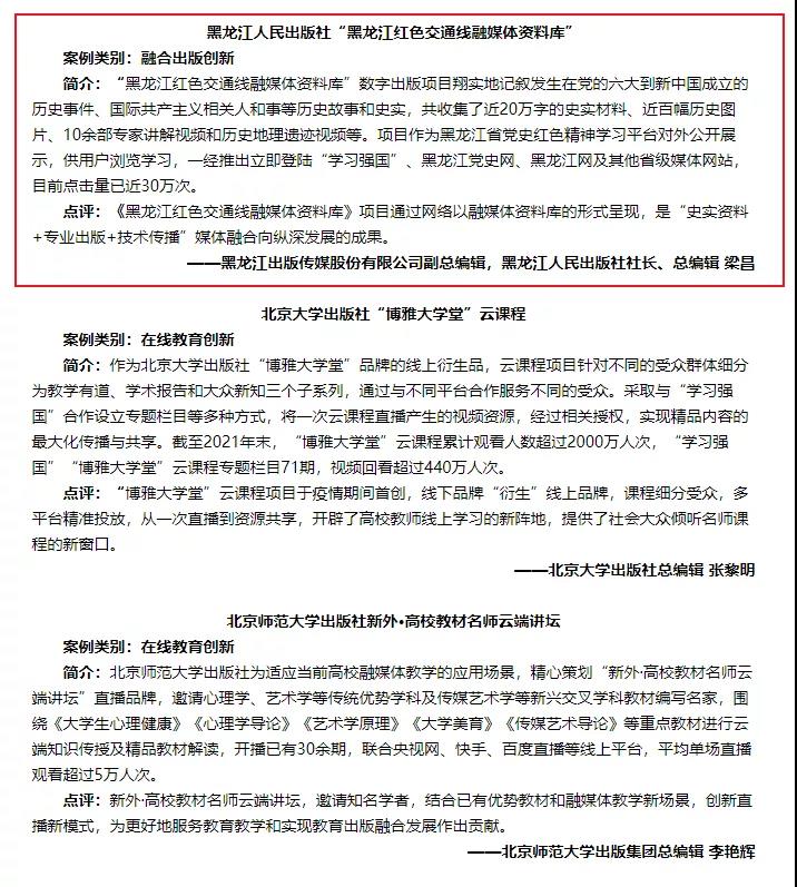 12月27日,《中国新闻出版广电报》公布“2021年度出版发行业年度创新20强”,黑龙江人民出版社“黑龙江红色交通线融媒体资料库”入选。