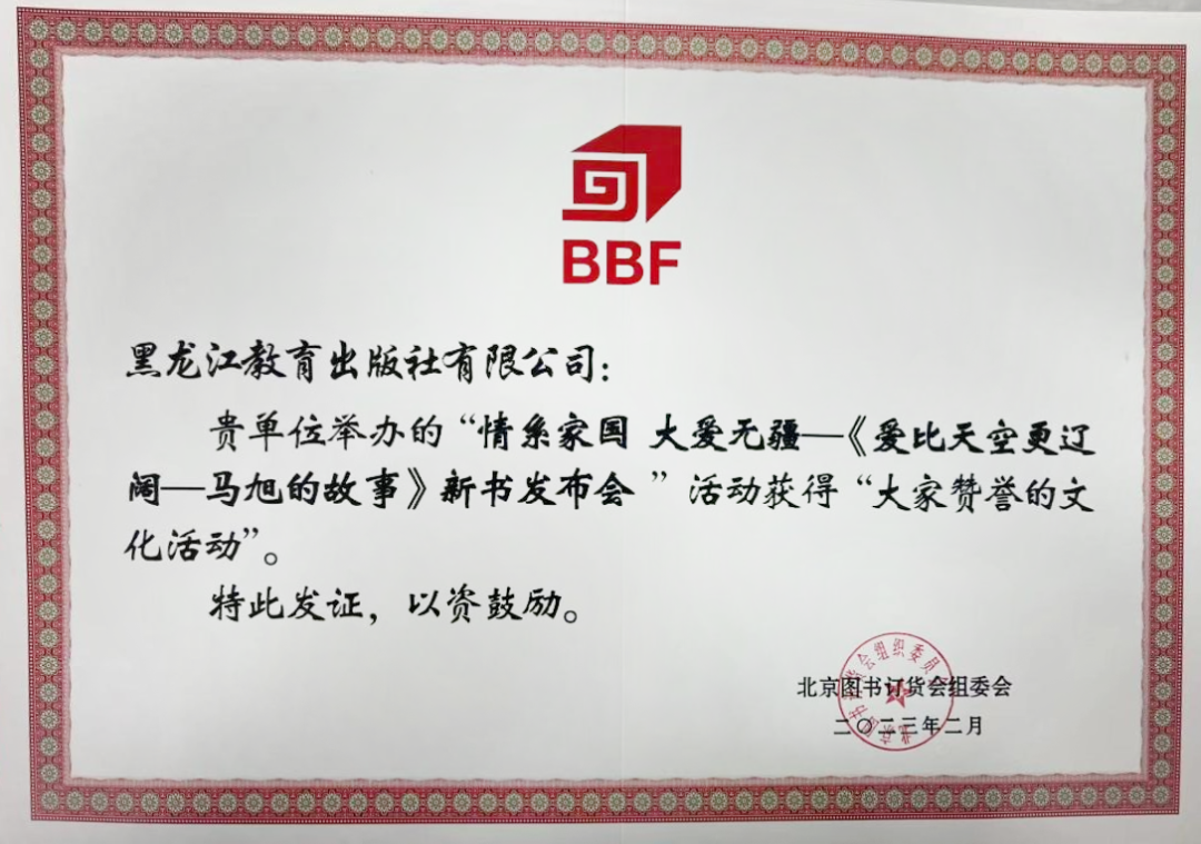 本次展会上,龙版传媒主办、黑龙江教育出版社承办的“情系家国 大爱无疆——《爱比天空更辽阔——马旭的故事》新书发布会”荣获“大家赞誉的文化活动”,龙版传媒参展展台荣获“受大家赞誉的展台设计”,黑龙江人民出版社的“出版融合发展——黑龙江红色交通线融媒体资料库”荣获“大家赞誉的出版新技术应用案例”,北方文艺出版社《铁人精神——一面永不褪色的旗帜 铁人钻井队的新时代征程》《一颗党心耀百年——百名共产党员口述历史》在组委会“奋进新征程 建功新时代”主题出版物社长荐书直播间进行阅读推广。