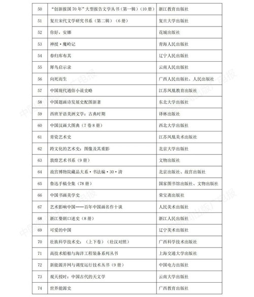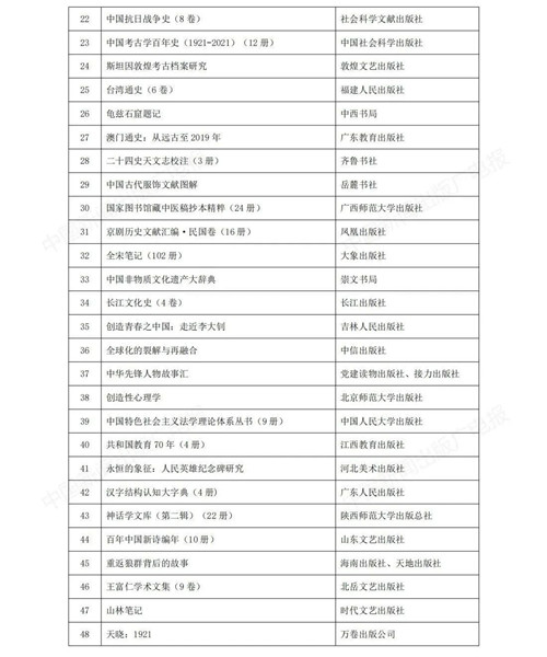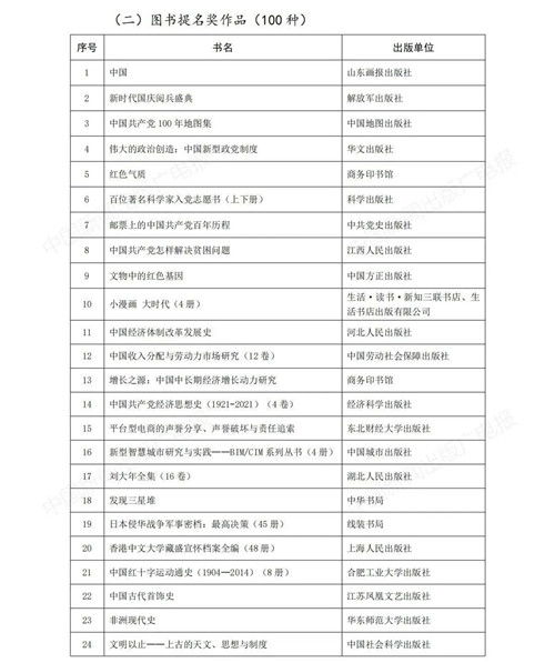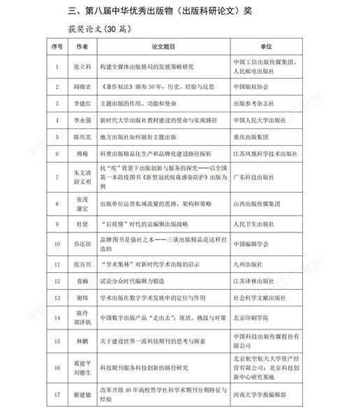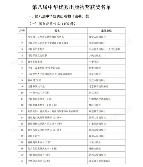 根据中央宣传部文件批复精神,由中国出版协会举办的第八届中华优秀出版物奖,于2023年2月22日评选揭晓。中华优秀出版物奖设图书奖、音像电子出版物奖、出版科研论文奖三个子项奖。本届获奖图书100种、提名奖100种;获奖音像电子出版物30种、提名奖80种;全国优秀出版科研论文30篇。现将获奖作品名单公示如下,自见报之日起7日内,如对获奖作品有异议,请列举具体事实,并署实名、联系方式,向第八届中华优秀出版物奖评委会办公室书面反映。