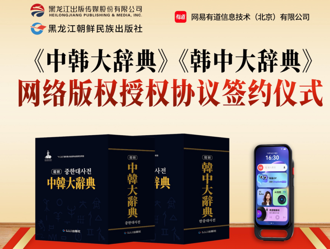 2025年6月18日,北京国际书展现场,黑龙江朝鲜民族出版社与网易有道信息技术有限公司隆重举行《中韩大辞典》《韩中大辞典》网络版权授权协议签约仪式。此次签约标志着两部总字数约3300万字的语言文化瑰宝正式开启数字化征程,为中韩文化交流与语言学习搭建起全新的科技桥梁。